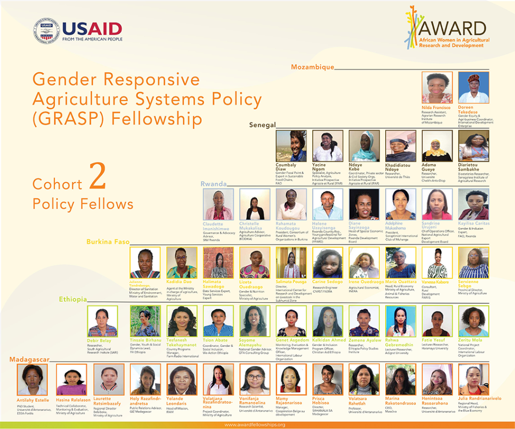 African Women in Agricultural Research and Development (AWARD) announced the Fellows in the second Cohort of its Gender Responsive Agriculture Systems Policy (GRASP) Fellowship. The two-year career development program aims to grow a pool of confident and capable mid-career African women to lead policy changes to improve African smallholders’ livelihoods, particularly women.